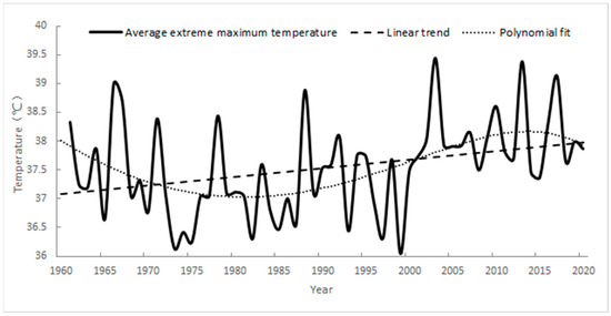 Interannual variation in mean extreme maximum temperature in East China during the period 1961–2020.