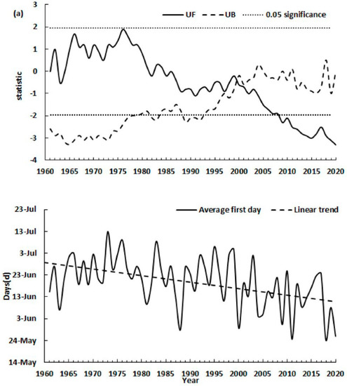 Variation trend and Mann–Kendall calculation of the mean (a) first and (b) last extreme maximum temperature event days in East China during the period 1961–2020.