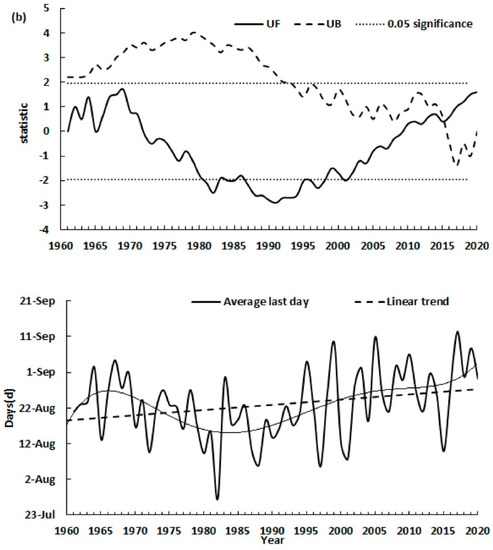 The mean first EMTE day was 20 June, and the mean last EMTE day was 22 August in East China during the 60-year study period. The linear trend and mutation detection results are shown in Figure 9. It can be seen that the mean first EMTE day shows an early trend and that the mean last EMTE day shows a late trend; significant changes and mutation points appeared in the 21st century. The mean first EMTE day was 23 June during 1961–1999 and 11 June during 2000–2020, which means it advanced by 12 days since the beginning of 21st century; M-K mutation detection also found that the year 2000 was a mutation point. Similarly, the mean last EMTE day was 20 August during 1961–1999 and 27 August during 2000–2020, i.e., a delay of 7 days since the beginning of the 21st century; the M-K mutation point appeared in 2015.