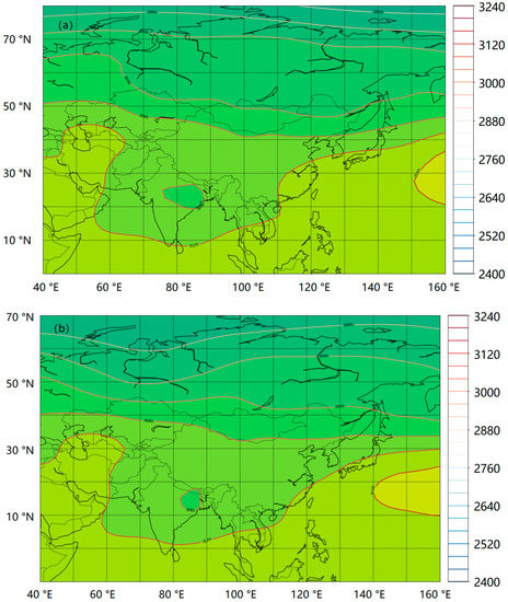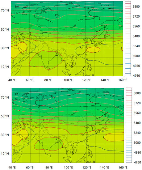 Calculated mean 500-hPa height field (geopotential) in July in typical years with (a) more and (b) fewer EMTEs in East China.