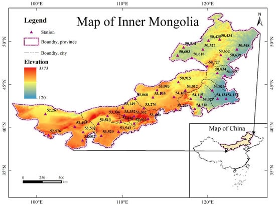 In this research, the daily total precipitation and temperature data during 1960–2019 of 44 stations in Inner Mongolia were extracted from the Daily Terrestrial Climatological Dataset in China (V3.0) released by the National Meteorological Information Center (http://data.cma.cn/, accessed on 16 September 2021). In order to ensure the quality of the data, it was checked and controlled before releasing. Based on the available meteorological records, stations with the records starting from 1960 and the percentage of missing values being less than 5% were selected. Finally, data from 44 stations were selected as survey samples, of which 35 stations collected data from 1960 to 2019 and 9 stations collected data from 1960 to 2017.