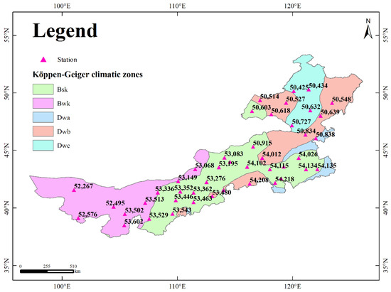 The average elevation of Inner Mongolia is about 1000 m. The highest elevation of Inner Mongolia is 3556 m at the Ho-lan Mountains. Inner Mongolia has a vast territory, high latitude, large plateau area, far away from the sea, and mountains along the border, and the climate is dominated by a temperate continental monsoon climate. Figure 2 shows the Köppen–Geiger climatic zones of Inner Mongolia. It has the characteristics of less and uneven precipitation, strong wind, and drastic temperature changes.