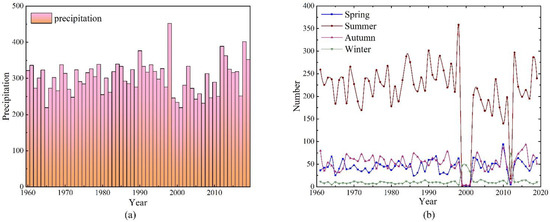 (a) The time series for the annual precipitation of the study area. (b) The time series for the precipitation for different seasons.
