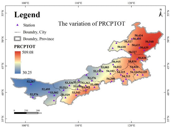 It can be shown that the spatial distribution of the mean PRCPTOT in Inner Mongolia during the period from 1960 to 2019 was obtained using Kriging interpolation based on ArcGIS software (ESRI, Redlands, CA, USA) (Figure 4). The spatial distribution characteristic of the mean PRCPTOT of the stations in Inner Mongolia exhibits an increasing trend from northwest to southeast, and there is a significant gap between the maximum and minimum. The minimum of the mean PRCPTOT is observed at Ejinaqi Station as 35 mm, while the maximum is 509 mm at Xiaoergou Station. The spatial difference of the mean PRCPTOT in Inner Mongolia is affected by climate, latitude, geography, and geomorphology. There is a significant difference in the mean PRCPTOT between the southern and northern foothills of the Yin Mountains. The humid air in the south is blocked by the Yin Mountains, resulting in less rainfall north of the Yin Mountains.