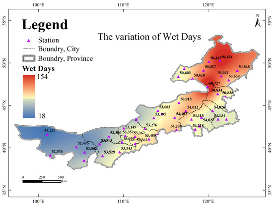 The spatial distribution of the mean wet days in Inner Mongolia during the period from 1960 to 2019 is exhibited in Figure 5. The minimum of the mean wet days is also observed at Ejinaqi Station as 18 days, while the maximum is 153 days at Aershan Station. Unlike the spatial distribution characteristic of the mean PRCPTOT, the maximum of the mean wet days is concentrated in the northeast of Inner Mongolia. The mean wet days in Southeastern Inner Mongolia is at a low level, but the mean PRCPTOT is at a high level, which leads to a higher mean SDII more prone to extreme precipitation events.