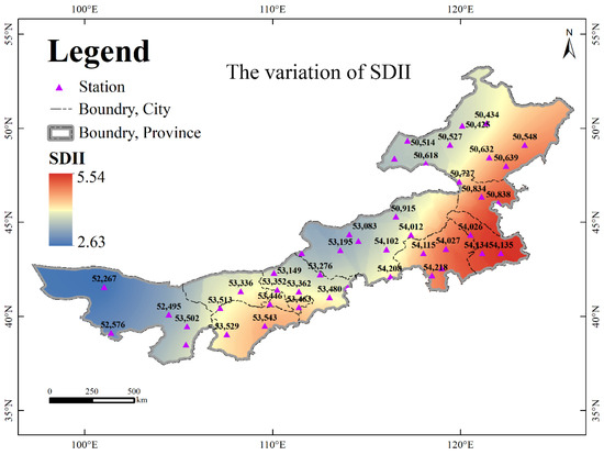 The spatial distribution of the mean SDII in Inner Mongolia during the period from 1960 to 2019 is exhibited in Figure 6. The minimum of the mean SDII is also observed at Ejinaqi Station as 1.93 mm/day, while the maximum is 5.99 mm/day at Zhalute Station. The variation trend of the spatial distribution of the mean SDII is consistent with that of the spatial distribution of the mean PRCPTOT, and the maximum of SDII in Southeastern Inner Mongolia proves the previous inference. Similarly, there is a significant difference in the mean SDII between the southern and northern foothills of the Yin Mountains. Under the influence of the monsoon, the moist air reaching the southern foothill of the Yin Mountains is lifted by the terrain during air movement. With the increase of altitude, the water vapor cools to form precipitation, making the precipitation at the southern foothill of the Yin Mountains higher than the northern foothill of the Yin Mountains.