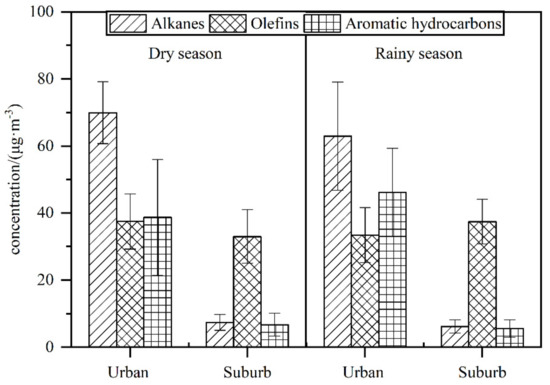 During the sampling period, 58 VOC compounds (alkanes, olefins, and aromatic hydrocarbons) were detected in the atmosphere at the urban and suburban monitoring sites in Jinghong, and a total of 48 VOC species were detected. As shown in Table 1, the total concentration of VOCs was (144.34 ± 36.15) µg·m−3 at the urban sampling site, which was much higher than at the suburban sampling site (48.21 ± 12.55 µg·m−3). Compared with the suburban sampling site, the urban sampling site in Jinghong was closer to various anthropogenic emission sources, which are susceptible to factors such as the emission of VOC sources of human activities. These emission sources have the characteristics of continuity, concentration, and high concentration, which make the concentration of VOCs in urban areas highly accumulated. As shown in Figure 2, in the dry season, the concentrations of alkanes, olefins, aromatic hydrocarbons, and TVOCs in the urban areas of Jinghong were (69.94 ± 9.25) µg·m−3, (37.53 ± 8.22) µg·m−3, (38.72 ± 17.32) µg·m−3, and 146.19 µg·m−3, respectively, with those in the suburban areas were (7.40 ± 2.34) µg·m−3, (32.22 ± 7.99) µg·m−3, (6.74 ± 3.43) µg·m−3, and TVOCs 47.15 µg·m−3, respectively. During the rainy season, the concentrations of alkanes, olefins, aromatic hydrocarbons, and TVOCs in urban areas were (62.93 ± 16.13) µg·m−3, (33.44 ± 8.22) µg·m−3, (46.13 ± 13.17) µg·m−3, and 142.5 µg·m−3, respectively, and those in suburban areas were (6.21 ± 1.99) µg·m−3, (37.48 ± 6.69) µg·m−3, (5.58 ± 2.65) µg·m−3, and 49.27 µg·m−3, respectively. The VOC groups at the urban sampling site were mainly alkanes, while the VOC groups at the suburban sampling site were mainly olefins. A nonparametric test (one-way analysis of variance, 95% confidence level) showed there were no significant differences in VOCs concentration and species composition between the dry season and rainy season (p > 0.05). The concentration of aromatic hydrocarbon groups in the urban sampling site was higher than that in the dry season, which may be related to the increase in benzene emissions due to the cooling of motor vehicle air conditioning and cooling in the rainy season.