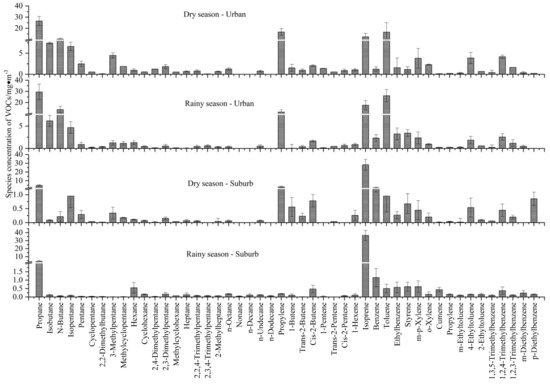 Figure 3 shows the distribution of VOC species concentrations in the dry and rainy seasons of the urban and suburban sampling site in Jinghong during the sampling period. As shown in Figure 2, the propane concentrations at the urban sampling site were highest during the entire sampling period. Higher alkane concentrations included propane, n-butane, isobutane, and isoamylene; alkene concentrations included isoprene and propylene species. Higher aromatic hydrocarbon concentrations were mainly toluene, which was much higher than the concentration of suburban points, reflecting the more significant impact of urban motor vehicle exhaust on the concentration of atmospheric VOCs. The concentration of isoprene in the suburban monitoring points was more prominent, which is closely related to suburban monitoring sites moving away from anthropogenic sources and closer to natural sources such as dense forests. This was followed by propane, probably related to petrochemical emissions. The concentrations of other species were low. The spectral characteristics of VOCs at the two sampling sites in Jinghong urban and suburban areas had a large difference, indicating that there were certain differences in the sources of VOCs between the two sampling sites in the city and suburb.