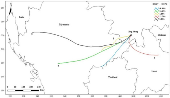 In this paper, TrajStat follow-up software [29] was used to analyze and study the backward trajectory of air masses in Jinghong. As the 500 m height wind field accurately reflects the average flow field characteristics of the boundary layer [27], the simulated height was chosen as 500 m. Jinghong (100°47′38″ E, 22°00′07″ N) was the simulated receiving point, 8:00 (Beijing time) every day was the pushback start time, and the 72 h backward trajectory of the receiving point from July 2016 to June 2017 was calculated, to reflect the characteristics of the airflow.
