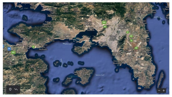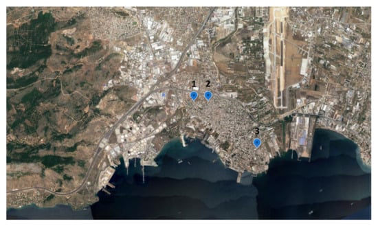 Spatial representation of the sampling sites in the municipality of Elefsina (1, 2, 3, Source: Google Maps).
