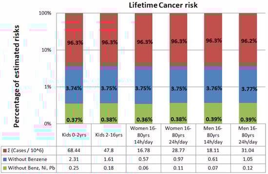 In the study of M.M. Jackson (2005) [31], the contribution of road traffic to the air pollution levels in Dar-es-Salaam city of Tasmania was examined; a risk assessment was conducted for the people who were in the nearby area. In the present study, the potential cancer risk for the residents in the region Elefsina was estimated for a variety of pollutants, including some heavy metals (Pb & Ni). In addition, according to U.S. EPA risk guidelines from 1986 [32], Pb has been classified, with a group B2 classification, as a potentially carcinogenic substance. The risk for cancer (R) was calculated from the following equations Equations (4) and (5):