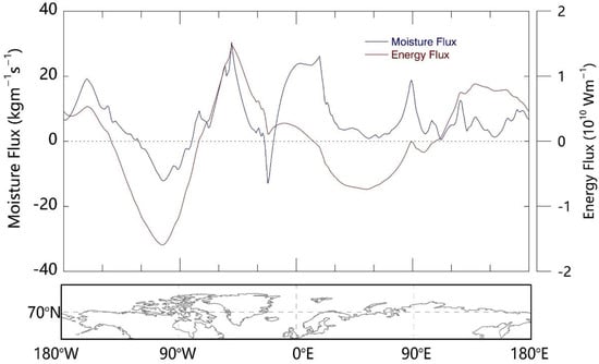 Longitudinal distributions of the climatological vertically integrated total meridional energy and moisture fluxes across 70° N during 1979–2020. Note that a positive value of meridional moisture flux indicates northward transport, while a negative value is southward.