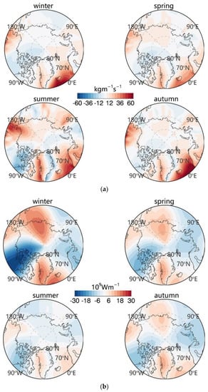 The meridional energy transport is more significant in winter than in other seasons. The main channels of northward energy transport are the East Siberian Sea, Greenland Sea, and Baffin Bay. Additionally, there is a large amount of southward energy flux in the Canadian Arctic Archipelago and the region extending to the North American continent, which is about 3 × 1010 W/m. In contrast to the meridional moisture flux, the intensity of northward energy transport in the Arctic increases sequentially in the summer (June-August, 0.62 × 108 W/m), spring (March-May, 1.00 × 108 W/m), autumn (September-November, 1.07 × 108 W/m), and winter (December-February, 1.33 × 108 W/m) seasons. The meridional energy transport is small throughout the Arctic in summer (1.04 × 1010 W/m), with a maximum value of only one-third that in winter (2.40 × 1010 W/m). In winter, there is stronger northward moisture and energy transport in the North Atlantic Ocean (Figure 2b winter), which may be related to the frequent cyclone activity in this region [35]. In addition, the spatial distribution pattern of the total meridional energy fluxes is essentially the same in winter, spring, and autumn distributions, implying that the intraseasonal variation in energy transport in the Arctic is small.