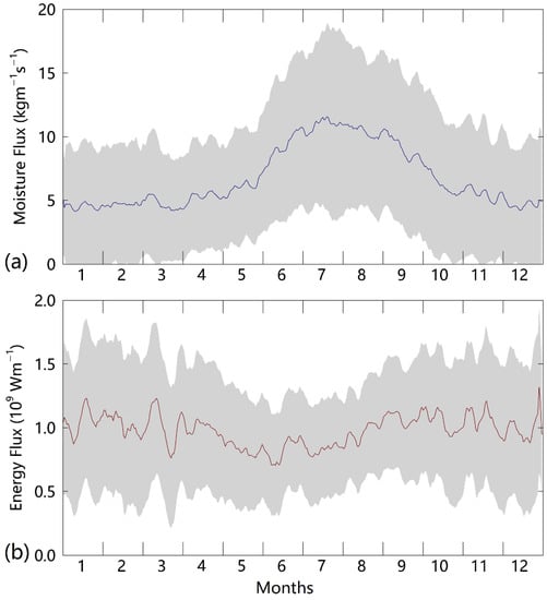 Seasonal variations in whole-layer (a) meridional moisture fluxes and (b) total energy fluxes across 70° N averaged over 1979 to 2020. The fluxes were obtained from the ERA5 product. Shading represents the mean plus/minus one standard deviation.