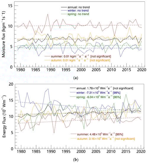 The series and trends of (a) meridional moisture flux and (b) energy flux across 70° N from 1979 to 2020. The record was obtained from the ERA5 dataset.