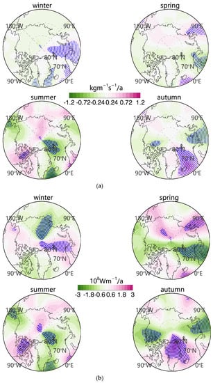 Spatial distribution of the trends of (a) moisture flux and (b) energy flux across 70° N in the ERA5 product over the period 1979–2020. The seasons are divided into spring (March to May), summer (June to August), autumn (September to November), and winter (December to February). The stippled grids denote those with trends significant at the 95% confidence level.