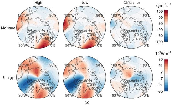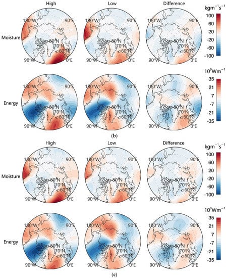 The atmospheric energy originating in lower latitudes can be transported to the Arctic, contributing to a rise in air temperature over the high latitudes of the Northern Hemisphere [14]. The influence of atmospheric energy transport on Arctic temperature extends from the sea surface to the deep troposphere [14]. Moisture and heat transport from lower latitudes to the Arctic can be influenced by the north–south gradient of humidity and temperature, respectively [15]. In addition, as the transport of moisture and energy is driven by wind, the behavior of the poleward transport of moisture and energy is regulated by large-scale circulations [16], such as the Arctic Oscillation (AO), North Atlantic Oscillation (NAO), and Dipole Anomaly (DA). Synoptic cyclones are a central component in maintaining the global atmospheric energy and moisture budgets. Hence, cyclones moving into the Arctic also play an important role in carrying water vapor and energy [17,18,19].