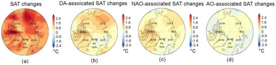 As shown in Figure 6a, the anomalously high AO index (1979, 1982, 1989, 1993, 1996, 2004 and 2019) in comparison with the low AO index (1990, 1991, 2000, 2005, 2006, 2012, 2014 and 2018) shows increased moisture entering the Arctic via the Barents and Kara Seas, as well as increased energy entering the Arctic from the North Atlantic and southward from the Canadian Arctic Archipelago (Figure 6a). The composite map based on the NAO index is largely consistent with the AO composite graph (Figure 6b). When the DA index was high (1989, 1995, 2000, 2012, 2015, 2016, 2018 and 2020), compared with when the DA index was low (1979, 1985, 1996, 2010 and 2011), the moisture from the Bering Strait to the Arctic increased (Figure 6c). This is related to the strong meridional wind across the pole from the Pacific sector toward the Atlantic sector during the positive phase of DA. Conversely, the moisture flux during the negative phase of DA originates from the North Atlantic and is transported much farther northward in the Arctic. The remarkable difference in energy transport between the positive and negative phases of DA occurs in the Bering Strait.Moisture transport appears to be favorable for a warmer Arctic. Figure 7 indicates that the DA-associated atmospheric circulation can benefit more from a rise in surface air temperature in the Arctic, with an especially evident regime over the Pacific sector (PAS). There has been an approximate rise of 1.9 °C in SAT over the PAS in relation to the enhancement of DA over the past four decades (Figure 7b). Interestingly, the PAS is an area that has experienced significant sea ice loss during the summer months over the past four decades (not shown). The significant NAO-associated SAT increases are mainly concentrated on the surrounding land area over northern Eurasia, the Canadian Arctic Archipelago, and western Greenland (Figure 7c). By comparison, the AO-associated SAT increase is not significant over most of the Arctic (Figure 7d). Combined with the results presented in Figure 6 and Figure 7, the greater effects of DA on Arctic warming are rather apparent compared to either NAO or AO.
