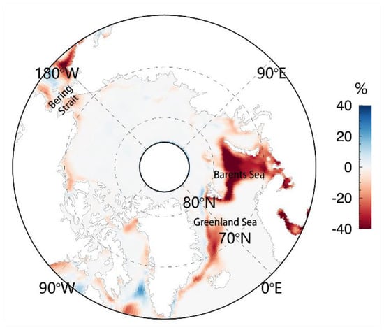 We used the satellite-derived daily sea ice concentration (SIC) provided by the National Snow and Ice Data Center (NSIDC) to investigate the relationship between the transport of moisture/energy and SIE variations, which was obtained from https://nsidc.org/data/nsidc-0079/versions/3 (accessed on 29 March 2022) [23]. SIC fields are available on a polar stereographic projection and are derived from the SMMR, the SSM/I, and the SSMIS by applying the bootstrap algorithm [23]. The latest version (version 3.1) of the dataset provides improved consistency between sensors through the use of a suite of daily varying tie points generated from AMSR-E observations. Both datasets have a spatial resolution of 25 km and a temporal resolution of 1 day. Note that sea ice extent (SIE) is defined as the area of the ocean where the SIC is at least 15%.