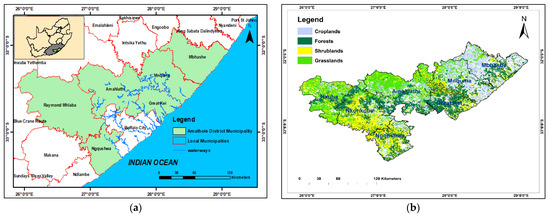 ADM in Eastern Cape Province of South Africa is located between 32°34′29.99″ S and 27°12′17.40″ E (Figure 1a), with an elevation of 1963 m. a.s.l. (6440 ft) and a total population of 892,637 [36]. Overall, the district covers a land area of 21,595 km² (8338 sq. mi) with approximately 200 km of coastline [37]. ADM comprises six local municipalities, which include Amahlathi, Ngqushwa, Great Kei, Mnquma, Mbhashe and Raymond Mhlaba. The district is ranked as the second richest biodiversity in South Africa [38]. This area is characterised by two bio-geographical regions, including the warm temperate south coast and the subtropical east coast [39]. In addition, the land comprises natural areas that are similarly diverse, which include moist mountainous, thornveld, well-watered coastal and semi-arid Karoo and succulent and thicket areas [32,40].