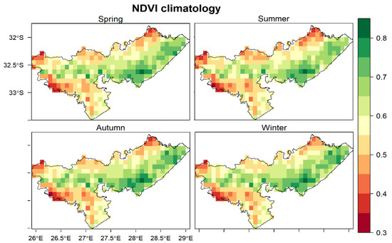 The study assessed spatiotemporal variations in the NDVI3g across Amathole District during the period from 1981 to 2015. The analysis of the NDVI3g climatology indicated that there was no distinct difference in vegetation characteristics across the seasons (Figure 2). However, for spatial characteristics, the values of NDVI3g increased from approximately 0.3 in the northern and western fringes to 0.8 in the southeastern part of ADM. The areas with low NDVI3g values were majorly dominated by grass and/or shrubs, while areas with high NDVI3g values were characterised by forest cover and/or crop landscape (Figure 1b).