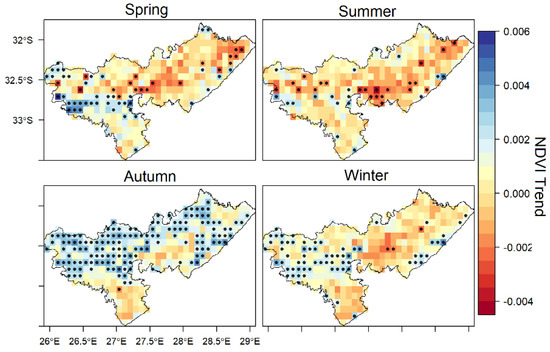 Spatial trends in the NDVI3g across the seasons for Amathole District Municipality. The stippling indicates pixels with statistical significance (p-value < 0.05).