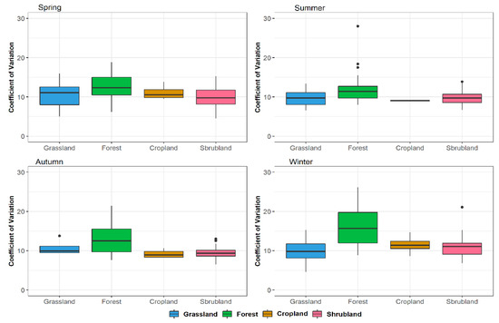 The boxplots (Figure 4) showed the long-term CV of the NDVI3g () across seasons and vegetation types. Again, the variations of the NDVI3g were uniform (mean ≈ 10) across the seasons and vegetation types, except for forest landscapes, which showed higher changes (mean ≈ 15) in the NDVI3g across seasons, for the analysis period.
