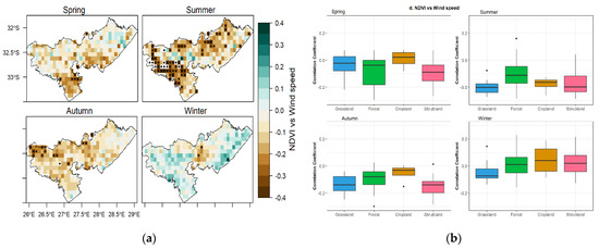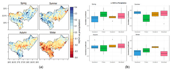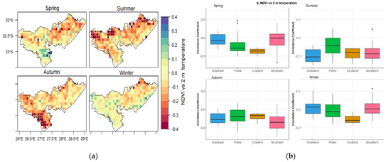 The pixel-wise partial correlation coefficients between the NDVI3g and the ERA5-Land temperature across the region are presented in Figure 5. The results showed negative correlations between the NDVI3g and the air temperature, majorly in the northeast in winter and spring. In summer, the negative correlations covered a wider part of ADM, and it occupied a much larger part, in autumn. The boxplot shows the upper and lower quartiles ranges with different classes of vegetation types in ADM. Specifically, the negative correlations (R ≈ 0.2) were dominated over croplands and forests in winter and spring. All vegetation types show a negative relationship with the air temperatures in summer and autumn, but stronger (R > 0.2) over grasslands and shrublands, relative to forests and croplands during these periods. These results are counter-intuitive, because vegetation growth is expected to increase with the rising temperature normally in the course of a growing season (spring–autumn). However, an extremely high temperature above the optimum for vegetation growth may induce vegetation stress in association with the rising soil moisture deficit [23]. Interestingly, the trends in ERA5Land air temperature show somewhat an increase over the analysis period, particularly from winter to summer (Figure S1). This suggests that air temperature could potentially drive vegetation changes during this period. Generally, the correlations between the NDVI3g and the ERA5-Land air temperature were low (R < 0.4) and largely insignificant across the seasons, particularly in spring and summer, and vegetation types.