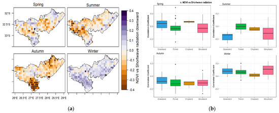 (a) Pixel-wise partial correlation coefficients between the NDVI3g and the ERA5-Land shortwave radiation downward for Amathole District Municipality; and (b) boxplots of correlation for vegetation types. The stipplings are for pixels with statistical significance (p-value < 0.05).