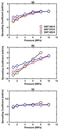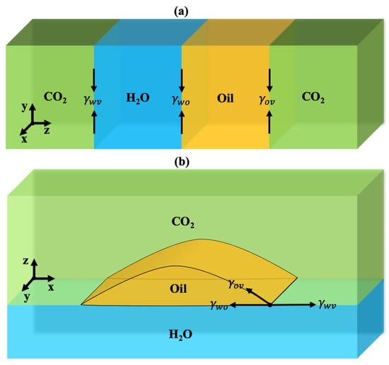 Figure 1a displays the schematic illustration of HO+CO+oil three-phase system. The DGT was applied for each pair of phases in the three-phase systems for calculating the interfacial properties []. Once the IFTs of each interface were obtained, the spreading coefficient S can be estimated as []: