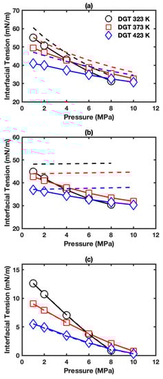 IFT as a function of pressure in HO+CO+cyclohexane three-phase system: (a) interface of aqueous phase+vapor phase; (b) interface of aqueous phase+cyclohexane-rich phase; (c) interface of cyclohexane-rich phase+vapor phase. The solid lines with symbols show the IFTs in three-phase systems. The dashed lines show the corresponding IFTs in two-phase systems.