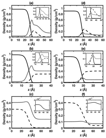 Equilibrium distributions of different species in HO+CO+hexane three-phase system at 323 K, 6 MPa (left panels) and 423 K, 6 MPa (right panels): (a,d) interface of aqueous phase+vapor phase (top panels); (b,e) interface of aqueous phase+hexane-rich phase (middle panels); (c,f) interface of hexane-rich phase+vapor phase (bottom panels). Solid, dashed, and dotted lines represent HO, hexane, and CO, respectively.
