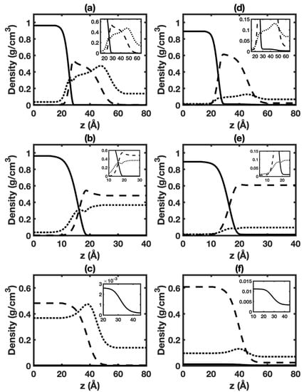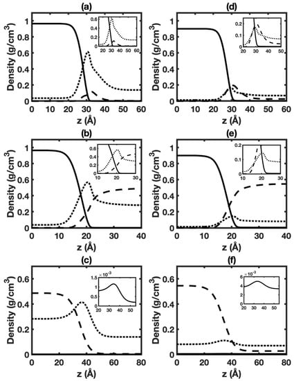 Equilibrium distributions of different species in HO+CO+benzene three-phase system at 323 K, 6 MPa (left panels) and 423 K, 6 MPa (right panels): (a,d) interface of aqueous phase+vapor phase (top panels); (b,e) interface of aqueous phase+benzene-rich phase (middle panels); (c,f) interface of benzene-rich phase+vapor phase (bottom panels). Solid, dashed, and dotted lines represent HO, benzene, and CO, respectively.