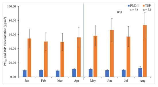 Figure 2 displays the PM0.1 and TSP mass concentrations for the sampling period. The averaged PM0.1 and TSP mass concentrations were 10.4 ± 1.2 and 58.3 ± 7.8 µg/m3, respectively. These TSP mass concentrations are lower than the TSP standard value from the WHO and Thailand guidelines (100 and 330 µg/m3, respectively) representing that the sources of PM emission were lower around the sampling site. Nevertheless, there is no standard for ambient PM0.1 in Thailand and other countries. The wet season has a higher mass concentration of PM0.1 and TSP than the dry season. The highest PM0.1 and TSP were found in August, as 12.7 ± 2.0 and 73.5 ± 18.4 µg/m3, respectively. The level of PM0.1 ranges from 14.5 to 20.7% that of TSP. The high mass concentration during the wet season is related to transboundary pollution from other countries. Particulate pollution during the haze period over southern Thailand was affected by peat-land fires in Indonesia [19,39]. High levels of PM pollution transport affect the air quality in southern Thailand almost annually during June–August [19]. In 2019, the high level of PM0.1 and TSP found in August at the sampling site indicates that long-range atmospheric transport accounts for an increased level of particulate matter at this time.