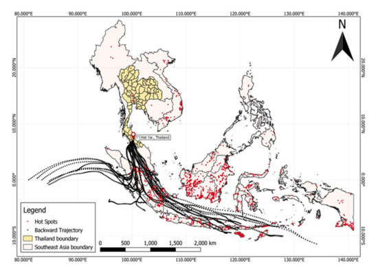Hotspots or active fires from open burning were derived from the satellite imagery, namely, moderate resolution imaging spectroradiometer (MODIS). The resolution of the hot spots is represented at a 1 km2 resolution for each spot. This study analyzes the five-day isentropic back-trajectories of air masses to classify the most likely biomass burning source regions influencing the measured PMs at the selection sites in Hat Yai, Thailand. Five days were likely to be sufficient time for most trajectories to pass through the possible source regions in SEA. Back-trajectories were produced using the Hybrid Single-Particle Lagrangian Integrated Trajectory model version 4 (HYSPLIT-4) [37]. It was accessed and run through the NOAA website (https://www.ready.noaa.gov/HYSPLIT.php; accessed on 9 March 2022). As shown in an earlier report, the ending height from 500 m AGL is calculated liable on the reference of the backward trajectory in Thailand [38].