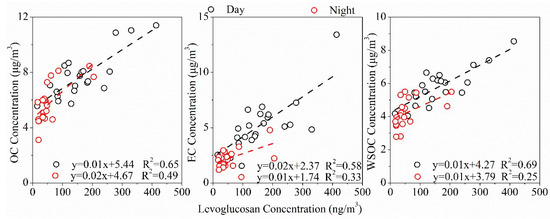 The mean day and night-time values of meteorological conditions and major chemical compositions of PM2.5 during the sampling period in the rural area of Guanzhong Basin are summarized in Table 1. Time variations of meteorological conditions are shown in the supplement (Figure S1). The average temperature and humidity during the sampling period in the daytime were 32.0 °C and 52.8%, and in the nighttime were 28.0 °C and 65.9%, respectively. Wind speed averaged 2.28 ± 0.62 m/s by day and 1.97 ± 0.45 m/s at night, and daytime and nighttime visibility were 12.17 ± 3.66 km and 10.21 ± 3.78 km, respectively. Lower wind speed and temperature are favorable for pollutant accumulation, resulting in higher PM2.5 mass concentration (64.56 ± 17.28 μg/m3) during nighttime than that during daytime (60.63 ± 9.93 μg/m3). Due to the fact that EC is mainly emitted from direct combustion sources and is chemically stable [28], the much higher concentration of EC (5.35 ± 2.21 μgC/m3) suggested the stronger anthropogenic emissions from biomass burning, coal burning and/or vehicle exhaust in the daytime. This result was consistent with the diurnal variation of K+ and levoglucosan, which are the two well-known tracers of biomass burning and present significantly higher concentrations by day. However, the mean concentrations of OC and WSOC by day were only slightly higher than those at night. This phenomenon possibly arose because the lower temperature and higher relative humidity by night (Table 1) were conducive to gas-to-particle partitioning of semi-volatile organic compounds [29]. EC, OC, and WSOC were significantly correlated with levoglucosan in Lin village (Figure 2), especially by day (R2 > 0.6), further confirming that biomass burning had a significant effect on atmospheric aerosols in that rural area.