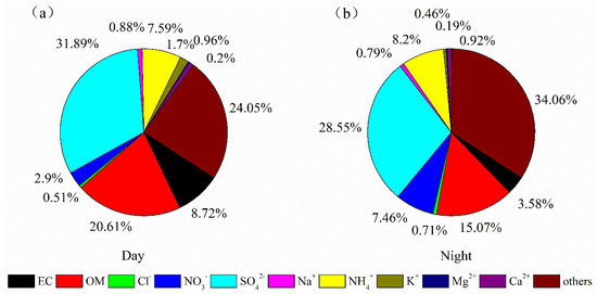 As shown in Table 1, due to the higher temperature and solar radiation favoring atmospheric photochemical oxidation, the mean concentration of O3 by day is 80.06 ± 28.92 ppb higher than that at night (42.28 ± 24.91 ppb). The mean concentration of LWC at night (19.88 ± 7.48 μg/m3) is much higher than that by day (12.19 ± 4.66 μg/m3), because that aerosol LWC is significantly controlled by environmental relative humidity [26,30]. The mean value of pHIS by day (−0.001 ± 0.56) is significantly lower than that at night (0.25 ± 0.45), indicating that aerosols are more acidic during the day. In order to understand the contribution of various chemical components to the total mass concentration of PM2.5 in the rural area of Guanzhong Plain, the matter balance calculation of 10 major components of PM2.5 was carried out, which were organic matter (OM), black carbon, secondary inorganic salts (including SO42−, NO3−, NH4+), etc. As shown in Figure 3, it can be seen that SO42− is the most abundant component, accounting for 31.89% and 28.55% of PM2.5 during the day and night, respectively. The main reason is that there are many chemical enterprises in Guanzhong Plain, and a large amount of SO2 discharged by them leads to high loading of SO42− in the atmosphere [31]. The second highest component is OM, accounting for 20.61% and 15.07% of PM2.5 during the day and night, respectively. By contrast, the concentration and relative abundance of NO3− and NH4+ by day are both smaller than that at night, mainly because NH4NO3 becomes more volatile when the daytime temperature is higher [32].