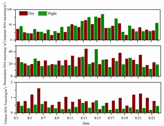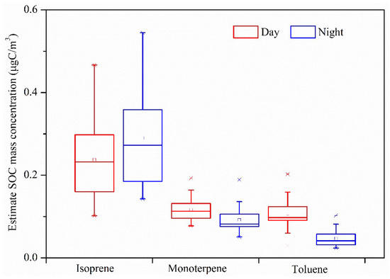 where is the concentration of SOC generated by a specific VOC precursor i; Σi[tri] is the sum of the concentrations of tracers derived from precursor i oxidation. With these mass fractions and the measured SOA tracers in the ambient air, the SOC from different precursors can be estimated in the atmosphere. The fSOC values were reported to be 0.233 μg/μgC, 0.155 μg/μgC, and 0.0079 μg/μgC for monoterpenes, isoprene, and aromatics, respectively [23]. The results of the calculated SOC are shown in Figure 6: the SOC concentration generated by isoprene by day and at night was the highest, followed by that of monoterpene, then toluene was the lowest. The SOC generated by isoprene by day was 0.24 ± 0.10 µgC/m3, and at night was 0.29 ± 0.12 µgC/m3, which was about 20.83% higher than that by day. Monoterpene produced SOC of 0.12 ± 0.03 µgC/m3 by day, which was higher than that at night (mean 0.09 ± 0.03 µgC/m3), which was about 8.33% higher than that by day. Toluene produced SOC of 0.11 ± 0.04 µgC/m3 by day, which was about twice as high as that at night (mean 0.05 ± 0.02 µgC/m3). The total calculated SOCs by day and by night were 0.25–0.71 (average: 0.46) and 0.26–0.78 (average: 0.42) µgC/m3, accounting for 3.35–10.58% and 3.87–13.51% of OC by day and by night, respectively. The estimated value was significantly lower than that above the Pearl River Delta (38.4%) [11], and that over Beijing (urban 32.2%; rural 39.2%) [49]. It is noteworthy that the actual atmospheric conditions are quite different from those prevailing in the smog chamber test, so fSOC based on smog chamber studies may be different from the actual smog chamber reaction [50].