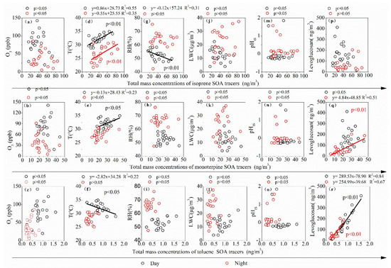 Figure 5 shows the correlations of BSOA tracers and aromatic SOA tracers with O3, temperature (T), relative humidity (RH), in-situ pH (pHIS), LWC, and levoglucosan. It can be seen from Figure 5a–c that the mass concentration of SOA produced by isoprene, monoterpene and anthropogenic aromatic hydrocarbon by day and by night has no significant linear correlation with O3 at p > 0.05, indicating that O3 volume concentration has little influence on the generation of BSOA tracers and aromatic SOA tracers of organic matter.
