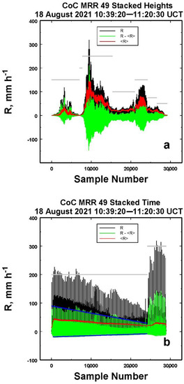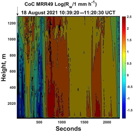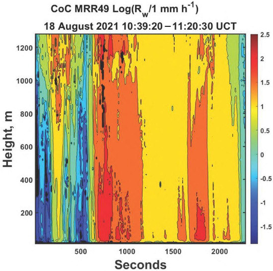Figure 1 is a plot of the time–height MRR vertical air velocity, attenuation-corrected rainfall rates using observations that were collected by an MRR radar as part of a National Science Foundation project and operated by the College of Charleston, located near Charleston, South Carolina. It is located on property owned by the College of Charleston Foundation that is used for a variety of ecological, educational, and research purposes (e.g., see [15]). The methodology for the correction of the data for vertical air velocity and attenuation was as explained in [7]. As one would expect for this time of year in South Carolina, the rain was associated with convection, having a wide range of rainfall rates. The most noticeable feature overall was the vertical structure of the rain that, of course, was not surprising in convective rain.