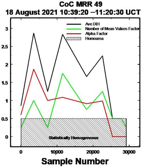 where H is the Heaviside unit step function requiring RDα to exceed 1.5. We referred that term to the alpha factor, and the second term was the number of mean values (Bayesian) factor. In purely statistically homogeneous data, α = 0 and Nb = 1 so that IXH = 0. In reality, these are very restrictive conditions rarely seen in real data, so we used IXH ≤ 0.5 as a sufficient indication of statistical homogeneity.