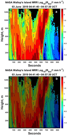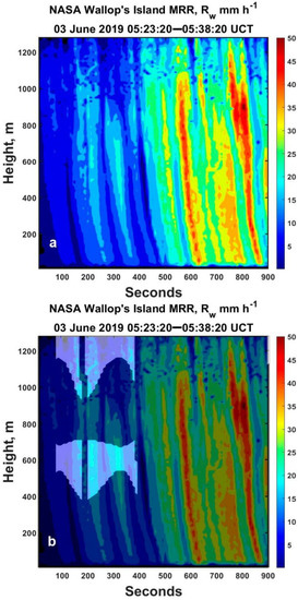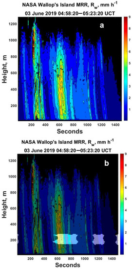 To see whether these results also applied to other data, we next considered three more sets of data (all from 3 June 2019) measured using a NASA MRR-Pro radar located at the Wallop’s Island Flight Facility. The rainfall rates were already previously determined, as explained in [7]).