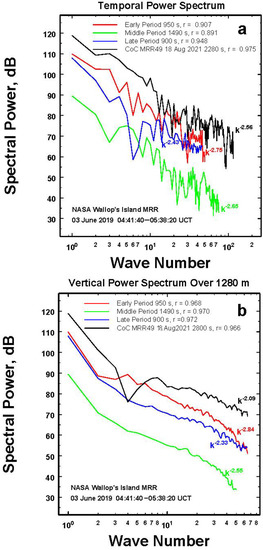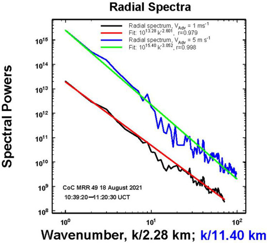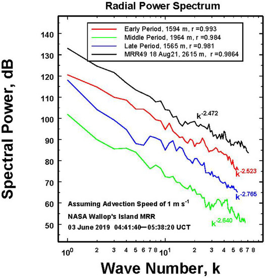 Nevertheless, in all cases, these radial power spectra could be well fit to the wave numbers by power relations with negative exponents ranging from 2.47 to 2.76 for both the NASA Wallop’s Island MRR observations and those using the College of Charleston MRR radar over a year later at the different location that was near Charleston, South Carolina. The precise values, however, were shown to depend upon the assumed advection velocity so that, with greater advection speeds, the wavelengths were stretched, leading to larger exponents as discussed in the text. Consequently, the only way to obtain estimates of the true spectral exponents was to collect measurements using spatially separated radars—a process being undertaken within a current grant.