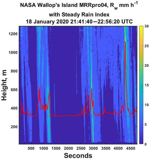 There are two ways to calculate these latter quantities. One is to look at the data for height at each time, and the other is to look across all times at a particular height. It is the former method that made sense here. The SRIndx is plotted as the solid red line in Figure 11. When the rain was steady, the number of drops was Poisson [21], and the SRIndx = 1 because, for Poisson rain, . This is indicated by the dashed line in Figure 11.