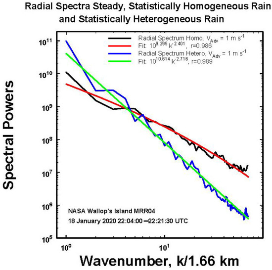 The computed radial power spectrum assuming an advection velocity of 1 m s−1 for the period of steady rain and for the next 1060 s of statistically inhomogeneous, non-steady rain, as discussed further in the text.