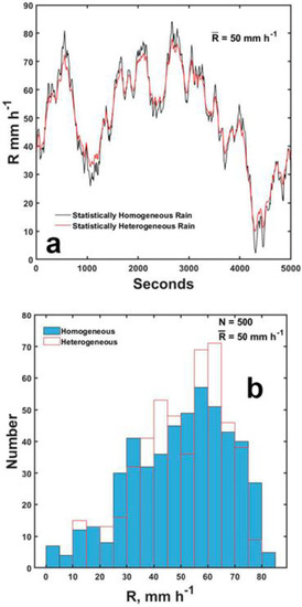 (a) Timeseries of synthesized data over 83 min using the two power spectra in Figure 12 showing real differences between the two; (b) histograms for each synthesized rainfall highlighting the differences in (a).