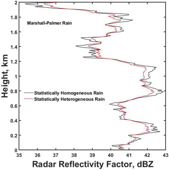It also suggests how radar observations of rainfall rate might vary with altitude depending on the radar beam dimensions and geometry of the observations, as illustrated in Figure 15 for Marshall–Palmer rain [25] using the relation Z = 200 R1.67. The limit of the x-axis implied a variation in the radar reflectivity factor of 8 dBZ (a factor of 6) aside from the usual statistical signal fluctuations.