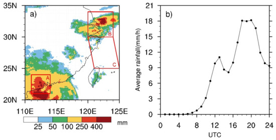 As can be seen from Figure 1a, under the influence of Typhoon Mangkhut, a significant amount of precipitation occurred in area A and area B. The yellow area with a daily precipitation exceeding 100 mm surpassed 50% of the total precipitation area, and the maximum daily precipitation exceeded 400 mm. The precipitation in area A corresponds to typhoon eyewall precipitation, and the precipitation in area B corresponds to typhoon long-distance precipitation, but there are other atmospheric processes involved.