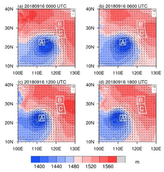 The 500 hPa geopotential height and wind from 0 to 18 UTC on 16 September 2018. (a) 0000 16 September, (b) 0600 16 September, (c) 1200 16 September and (d) 1800 16 September. A stands for the Pearl River Delta, B stands for the Yangtze River Delta and C stands for the water vapor transport channel.
