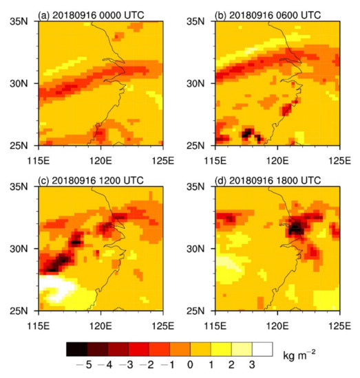 Vertically integrated moisture divergence from 0 to 18 UTC on 16 September 2018. (a) 0000 16 September, (b) 0600 16 September, (c) 1200 16 September and (d) 1800 16 September.